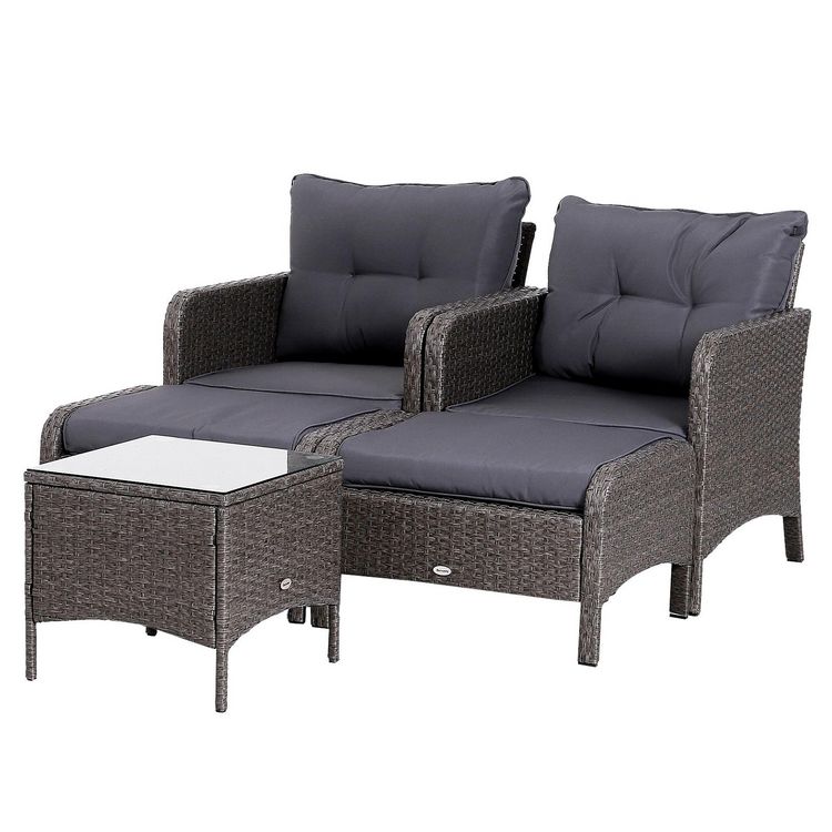Outsunny Lot de 2 fauteuils de jardin grand confort repose-pied table basse résine tressée imitation rotin coussins gris