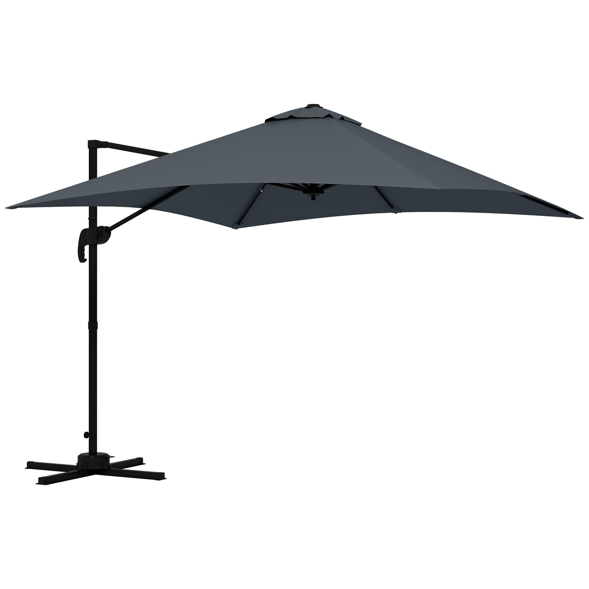 Parasol déporté carré inclinable pivotant 360° manivelle piètement acier dim. 2,95L x 2,95l x 2,66H m gris