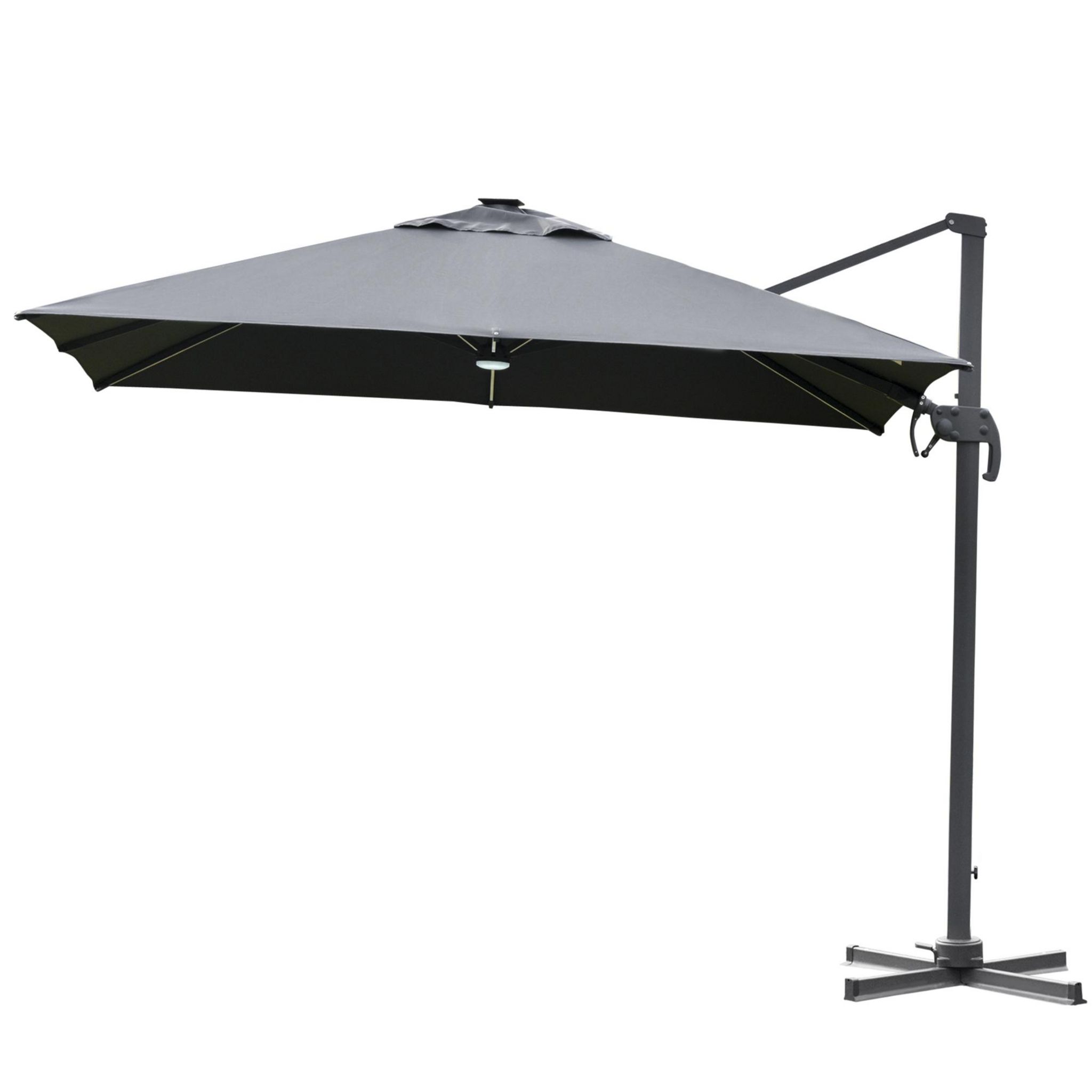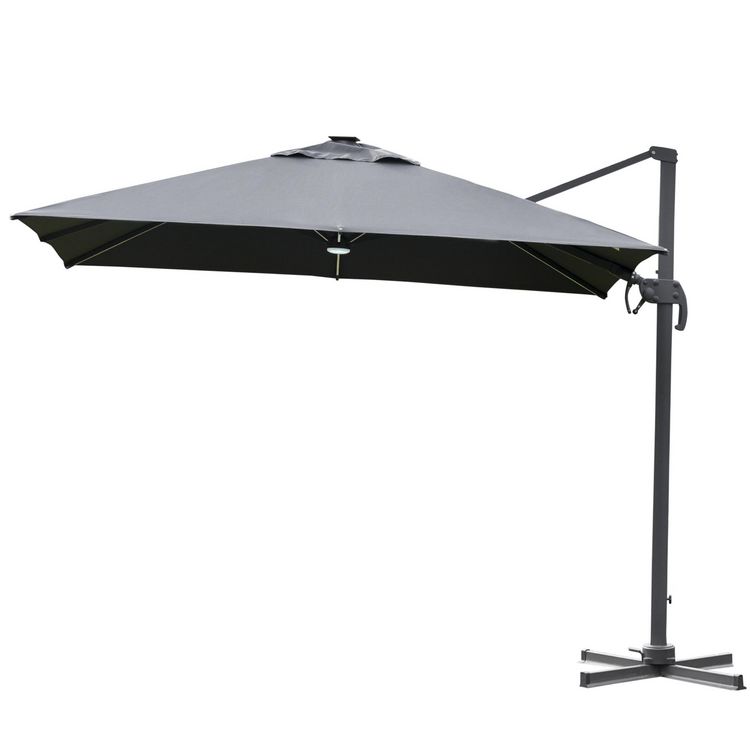 Parasol déporté carré parasol LED inclinable pivotant 360° manivelle piètement acier dim. 3L x 3l x 2,66H m gris
