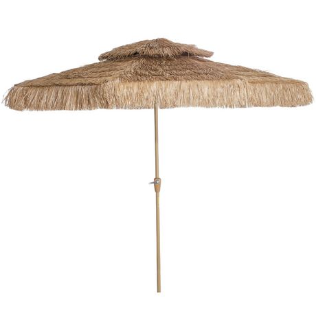 Parasol droit style Hawaïen - parasol à franges raphia diamètre 294 cm - manivelle métal marron clair