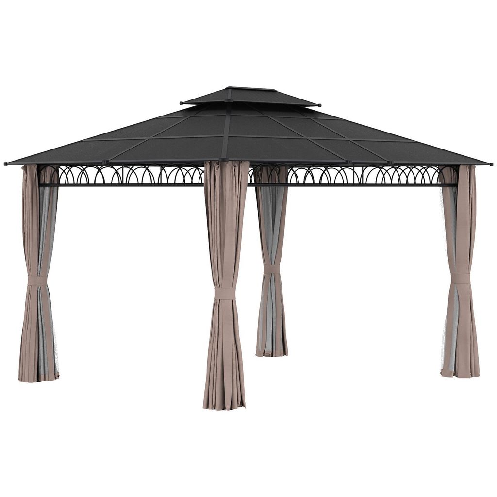 Pavillon de jardin tonnelle rigide dim. 3,6L x 3l x 2,78H m rideaux latéraux anti-UV structure gris toit polycarbonate noir