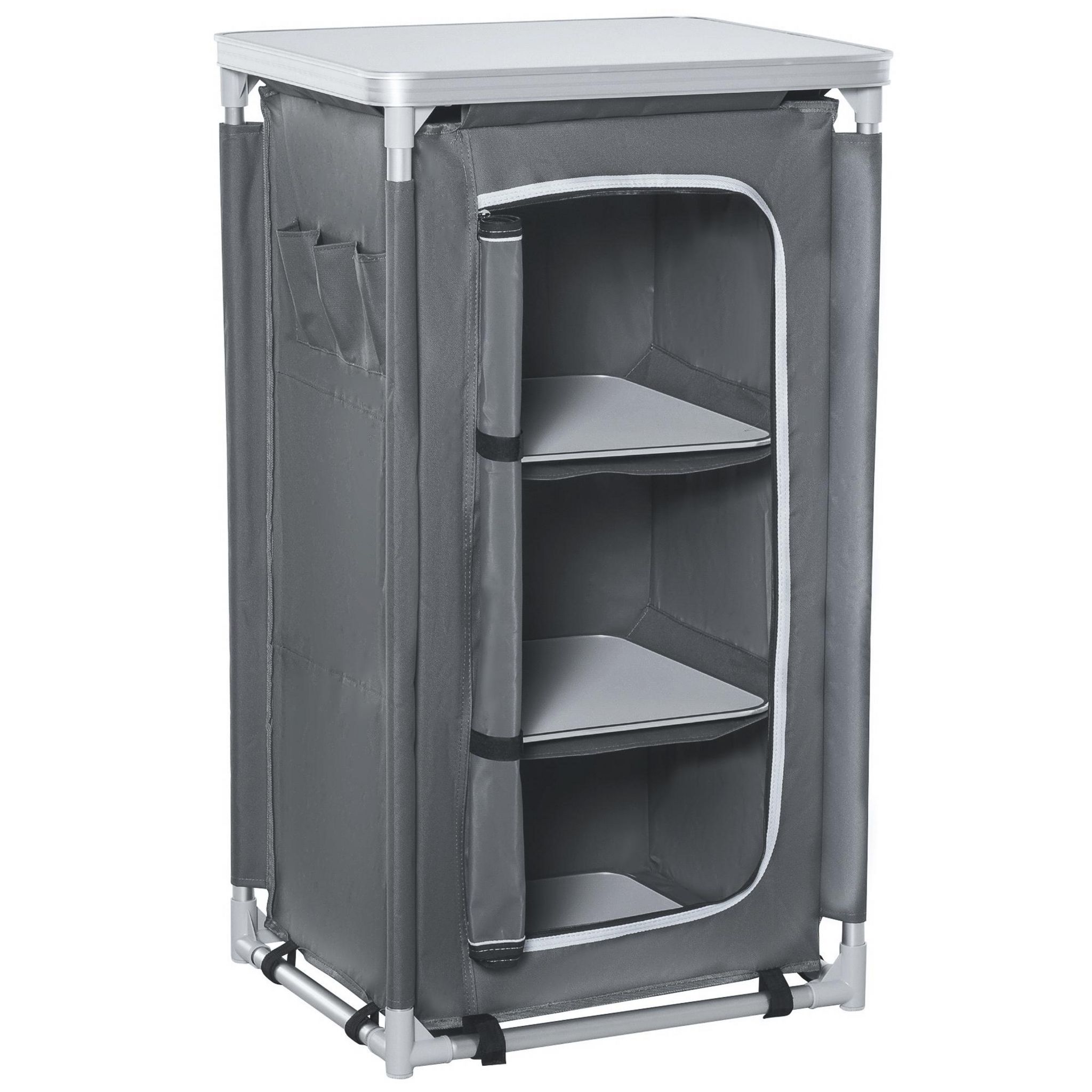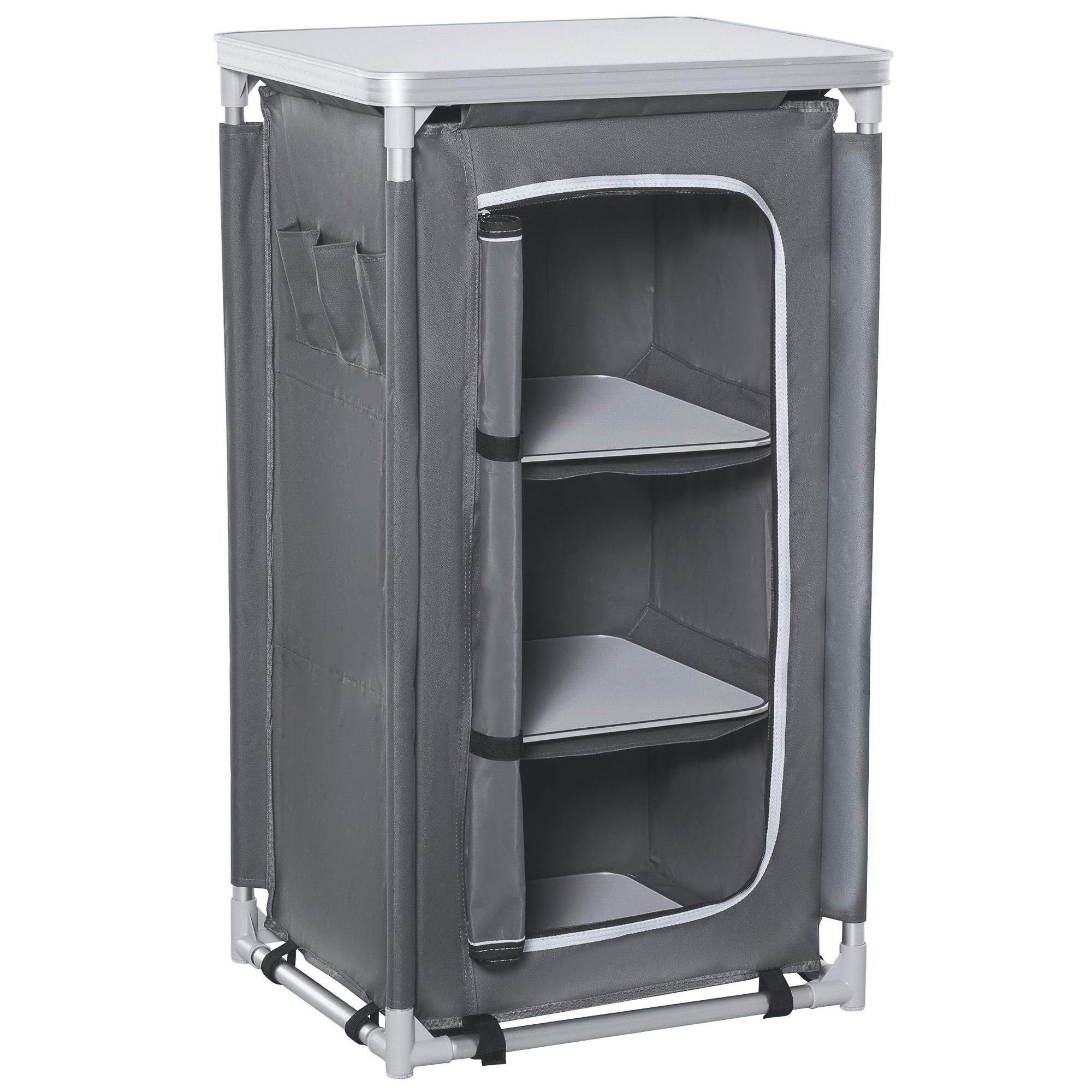 Idéale pour les barbecues, le camping ou les fêtes, notre cuisine de camping en aluminium est légère et facile à utiliser. Elle inclut une table avec un espace de rangement et un organisateur à trois niveaux pour vos provisions et ustensiles. Sa surface supérieure offre un espace parfait pour la pré