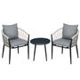 Salon de jardin 2 personnes 3 pièces 2 fauteuils avec coussins table basse ronde plateau verre trempé corde tressée métal gris
