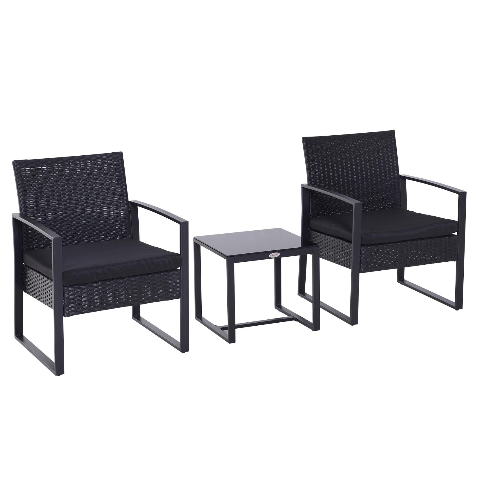 Salon de jardin 2 places - 3 pièces 2 chaises avec coussins + table basse - plateau verre trempé - résine tressée 4 fils imitation rotin noir