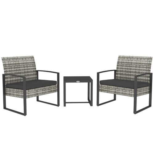 Salon de jardin 2 places 3 pièces 2 chaises avec coussins + table basse plateau verre trempé résine tressée aspect rotin gris