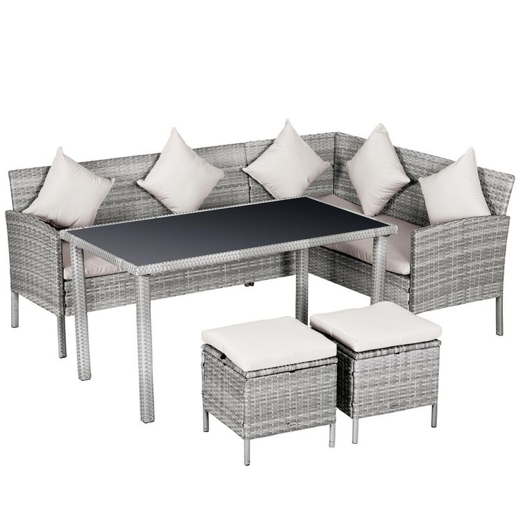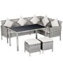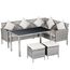 Salon de jardin 6 pers. grand confort canapé d'angle + 2 poufs + table à manger 9 coussins assise & dossier fournis résine tressée grise