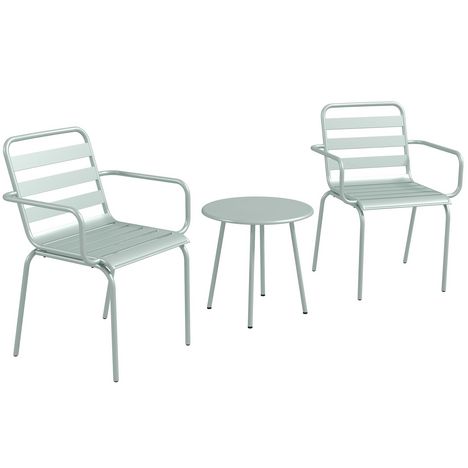 En savoir +Ce splendide ensemble bistro composé d'une table basse ronde accompagnée de 2 chaises empilables sublimera votre extérieur que ce soit un balcon, une terrasse ou un jardin. Son design altique vous rappellera les terrasses des bistros français d'antan. Robuste, léger et facile à ranger, ce salon de jardin en acier thermolaqué s'adaptera à tous les espaces.