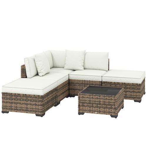 - Cet ensemble de salon de jardin extérieur comprend deux canapés sans accoudoirs, un canapé d'angle, deux repose-pieds et une table basse, que vous pouvez disposer librement.