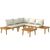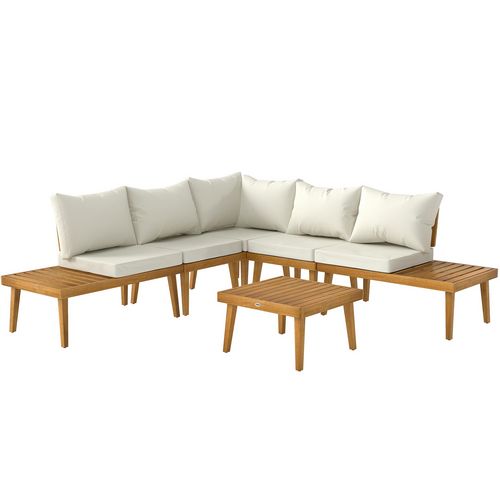 Salon de jardin d'angle 5 places en bois d'acacia avec table basse et tablettes latérales coussins crème