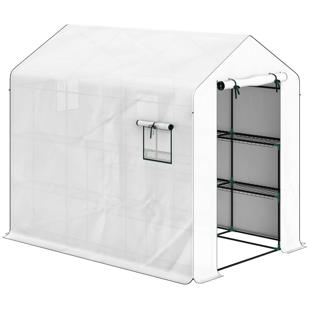 Serre de jardin 4 étagères - porte enroulable zippée, 2 fenêtres - 143 x 215 x 190 cm - acier vert PE blanc