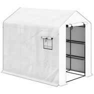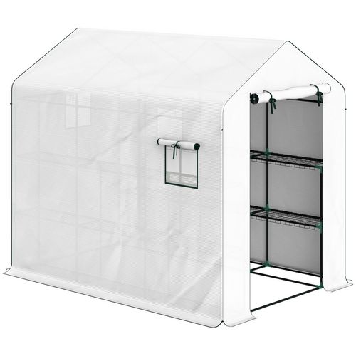 Découvrez la serre Outsunny de 143 x 215 cm, dotée d'un cadre robuste en acier et d'un aménagement intérieur flexible. Elle inclut deux étagères par côté et une couverture en plastique renforcée pour une durabilité accrue. Parfaite pour favoriser une croissance saine, elle possède une porte enroulab