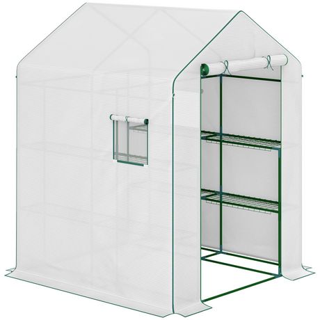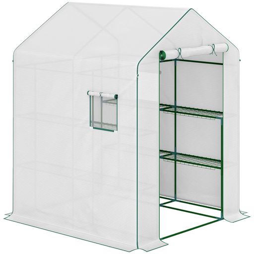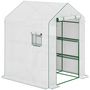 Serre de jardin 4 tablettes dim. 1,4L x 1,43l x 1,9H m porte déroulante fenêtre acier PE haute densité blanc