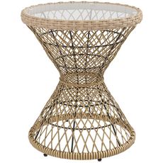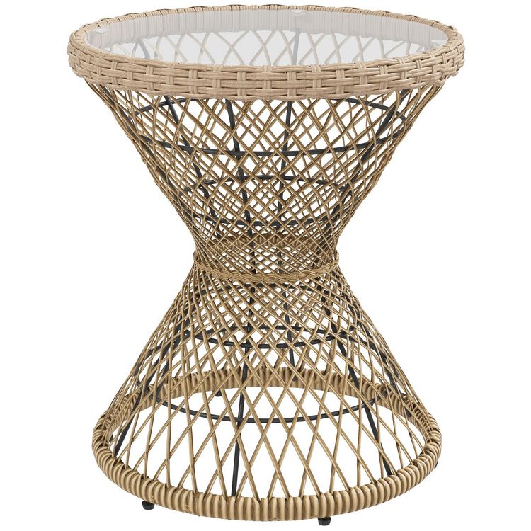 Table basse ronde de jardin en résine aspect rotin métal et plateau verre trempé Ø 45 x 52H cm beige
