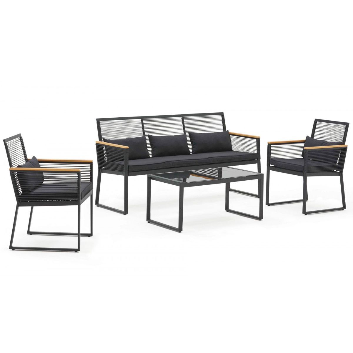 Design moderne et original avec sa structure en acier habillée de fils en résine noire et ses accoudoirs en polywood