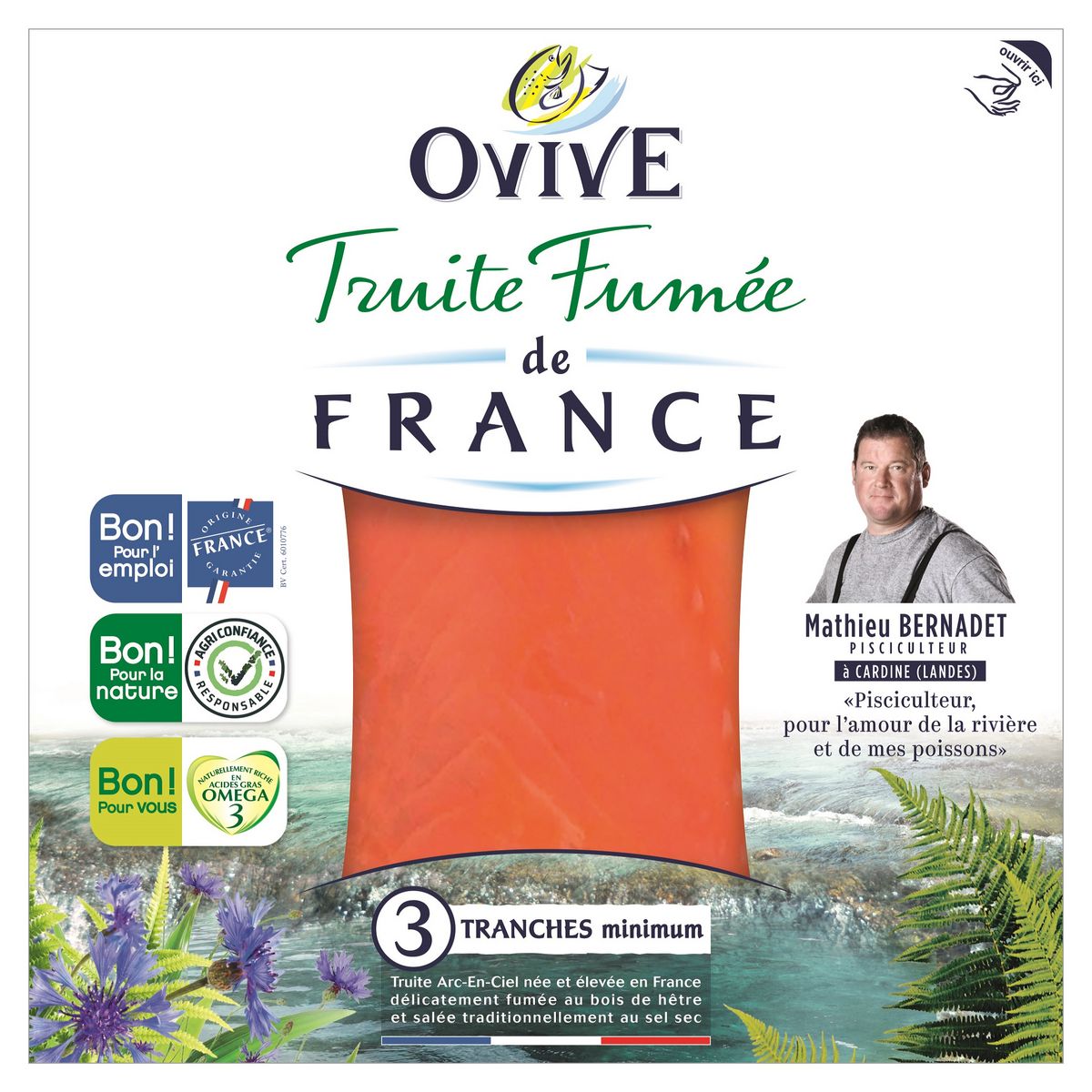 100% française, de l'élevage à la transformation, peu grasse, indication du nom de l'éleveur et du site d'élevage, certification agri-confiance, Origine France Garantie, naturellement riche en acides gras oméga 3