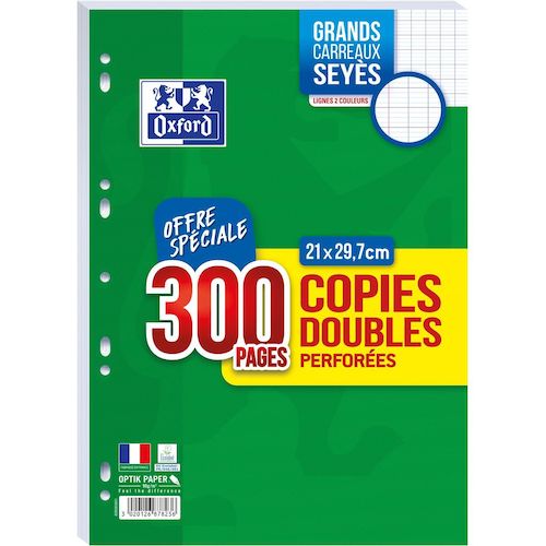 En savoir +Copies doubles Oxford perforées de 300 pages avec une réglure Seyès. Parfait pour la rentrée des classes ou pour un approvisionnement de bureau. OXFORD, c'est aussi l'histoire d'un papier que l'encre ne traverse pas, d'une blancheur parfaite et au toucher extra-lisse. Autant d'éléments obtenus grâce à la qualité Optik Paper pour un confort d'écriture inégalable. Produit certifié Ecolabel EU (faible impact environnemental de la fabrication du papier) et certifié PEFC (gestion durable des forêts).