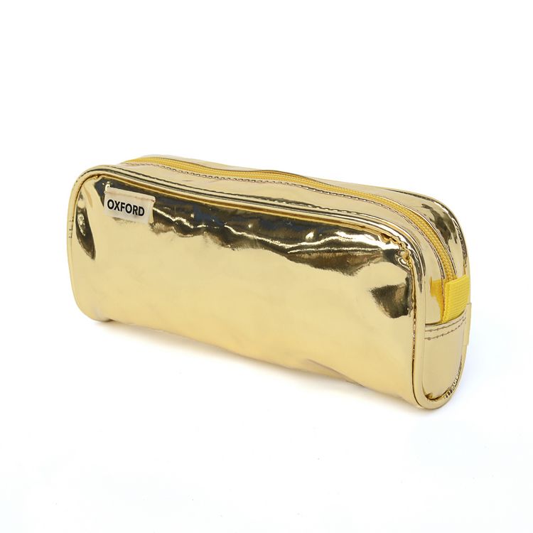 Fourre tout de forme rectangulaire 1 compartiment aspect métallique en PVC de 3 coloris assortis. La taille des glissières est supérieure à la taille standard, les tirettes sont personnalisées.