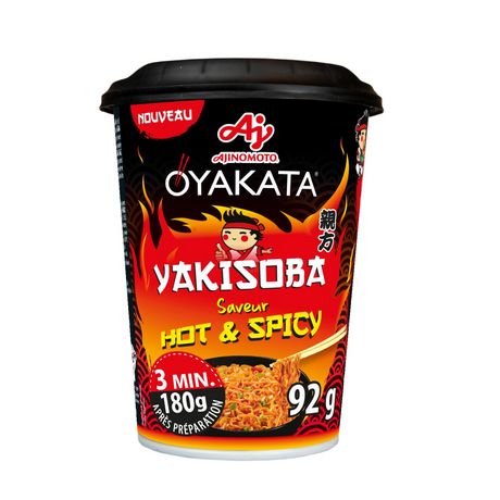 Découvrez les nouilles sautées Yakisoba Oyakata ! Prêtes en 3 minutes avec un peu d'eau bouillante, elles vous offrent une savoureuse pause-repas réconfortante. Laissez-vous tenter par la saveur Hot & Spicy qui se caractérise par ses notes de piment et d'ail, pour les palais amateurs de piquant !