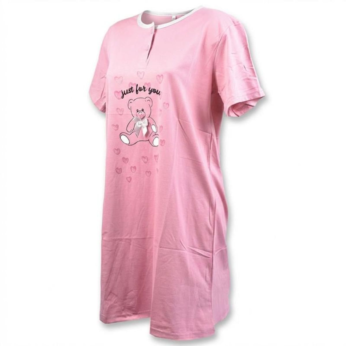 Chemise de nuit femme manches courtes col rond avec boutons. Coupe fluide confortable ideale pour dormir ou se detendre a la maison. Motif ourson Just for you entoure de petits coeurs avec ruban cousu elegant au niveau du noeud papillon. Design tendre et feminin. Tissu doux agreable a porter. Dispon