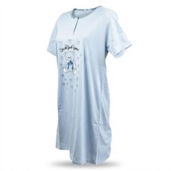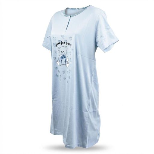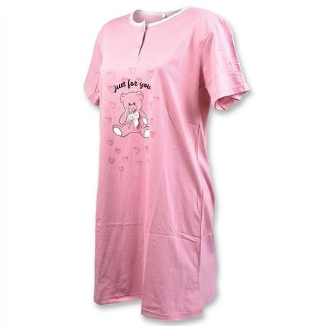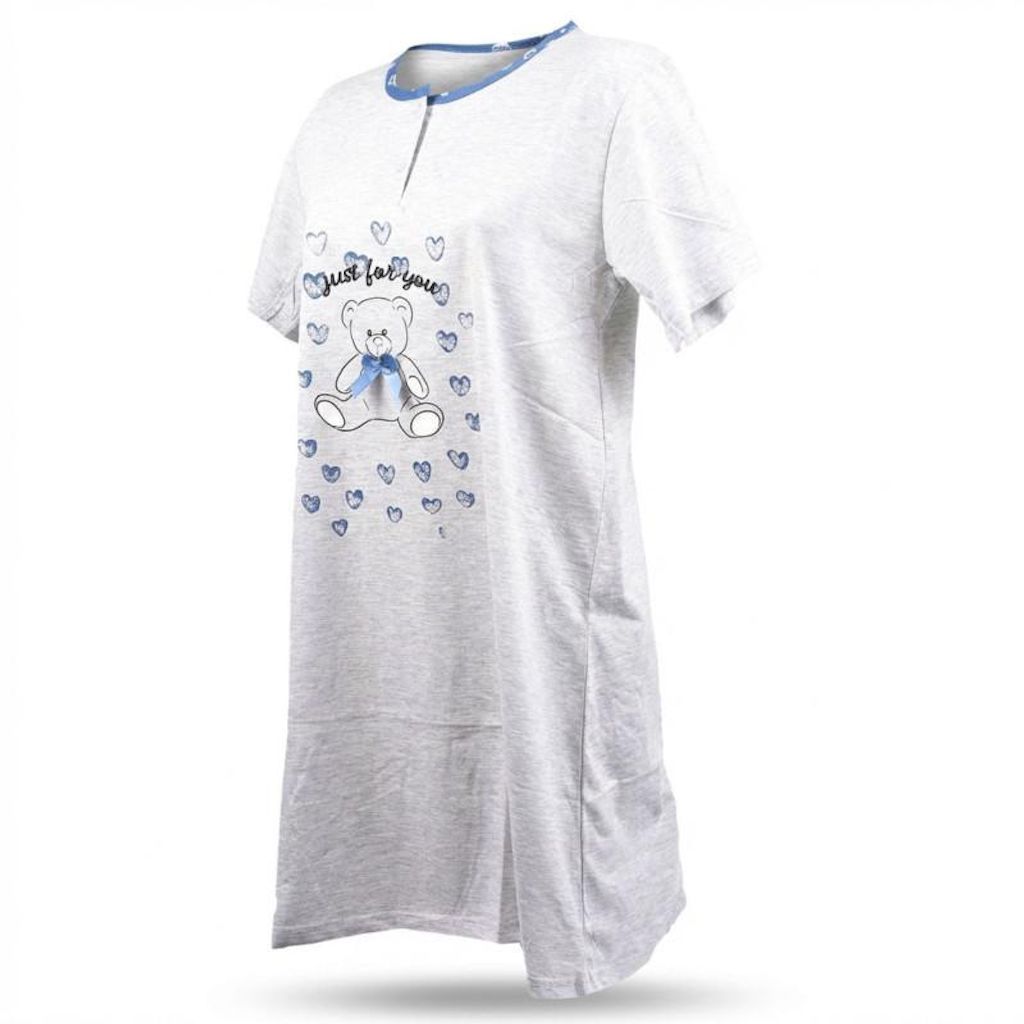Chemise de nuit femme manches courtes col rond avec boutons. Coupe fluide confortable ideale pour dormir ou se detendre a la maison. Motif ourson Just for you entoure de petits coeurs avec ruban cousu elegant au niveau du noeud papillon. Design tendre et feminin. Tissu doux agreable a porter. Disponible en rose gris et bleu. Tailles du M au XXXL