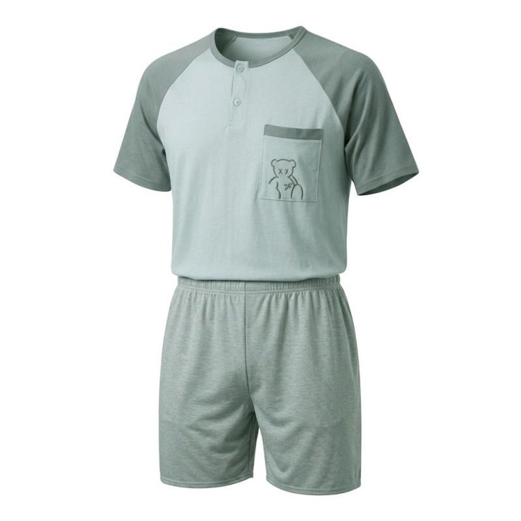 Pyjama court homme confortable en coton majoritaire compose dun t shirt bicolore manches courtes avec col rond boutonnes et poche poitrine decorative brodee nounours. Le design du haut reprend la couleur du short sur les epaules les manches et la bordure de poche pour creer un ensemble harmonieux moderne et jeune. Le short uni dispose dune taille elastique souple qui sadapte naturellement a la morphologie et assure un bon maintien pendant la nuit. La matiere douce et respirante offre un excellent confort pour dormir pendant les nuits deté ou pour se detendre a la maison. Ce pyjama homme combine style moderne coupe confortable et tissu leger pour accompagner les moments de repos et de relaxation. Disponible du S au XXL il convient a de nombreuses morphologies et constitue un pyjama ideal pour les hommes recherchant un vetement de nuit confortable moderne et agreable a porter