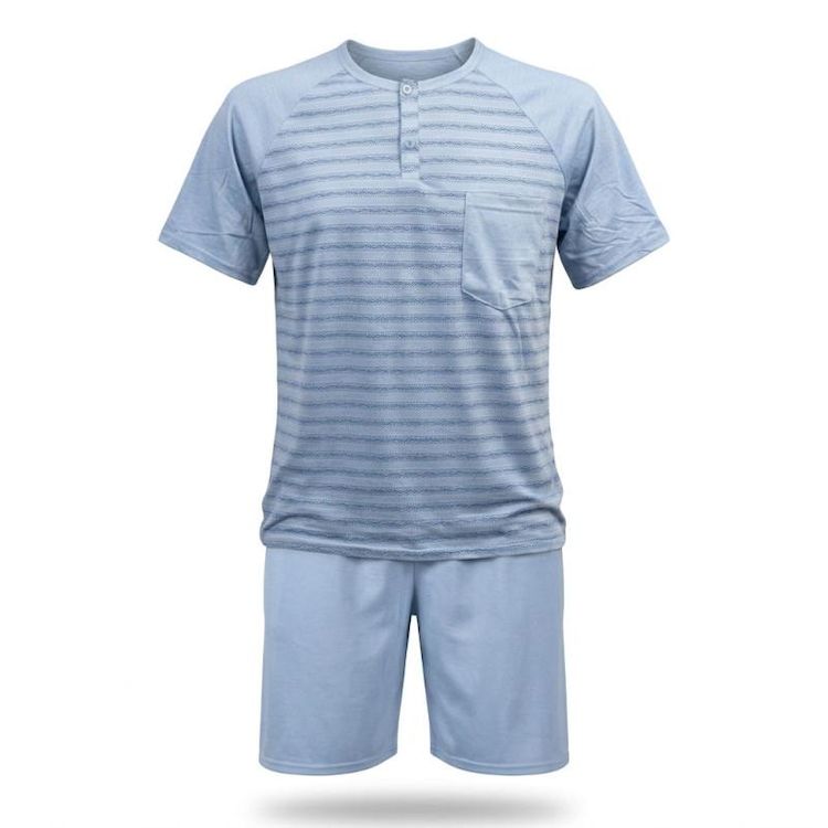 Pyjama court homme confortable et moderne ideal pour les nuits dete et les moments de detente a la maison. Lensemble se compose dun tee shirt manches courtes col rond avec patte de boutonnage a deux boutons et dune poche poitrine gauche. Le tee shirt presente un imprime graphique compose de lignes et de petits motifs alignes formant un style tribal discret. Limprime est present sur lavant et larriere du tee shirt tandis que les manches et la poche restent unies afin de creer un contraste visuel elegant. Le short assorti est volontairement uni pour equilibrer le design du haut imprime. Sa taille elastique assure un maintien confortable tout en laissant une grande liberte de mouvement pendant le sommeil ou la detente. Ce pyjama court homme combine style moderne confort et legerete pour accompagner les nuits chaudes et les moments de relaxation. Disponible en plusieurs coloris bleu bleu marine et vert et propose dans une large gamme de tailles du M au triple XL il sadapte a de nombreuses morphologies et devient rapidement un indispensable du vestiaire nuit masculin