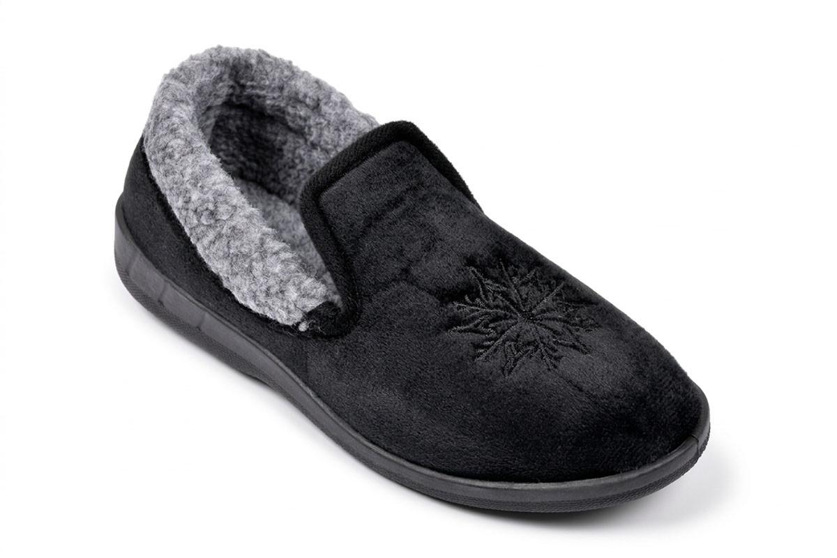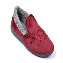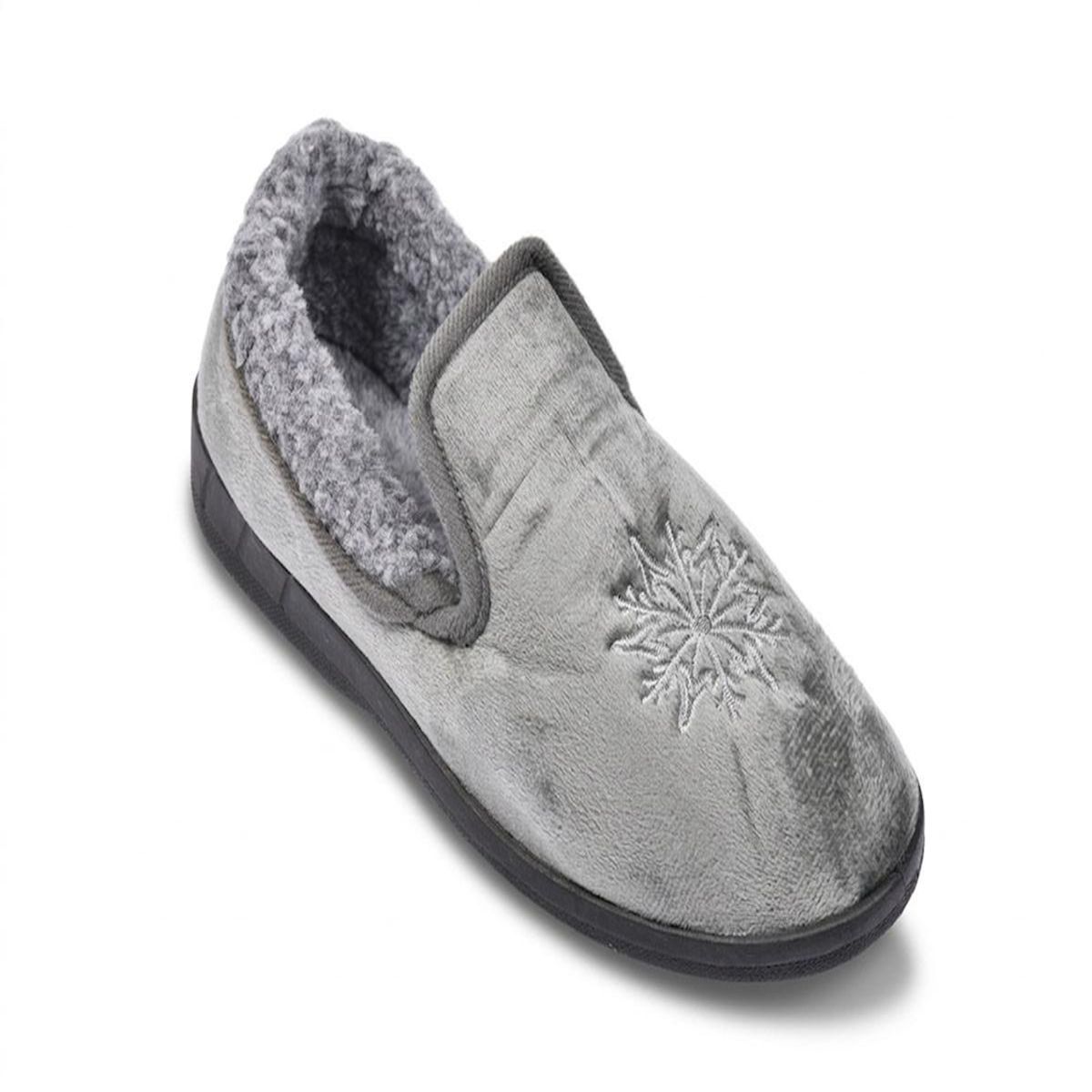 Pantoufles femme de type charentaises concues pour offrir un maximum de confort et de chaleur au quotidien. La tige en velours doux procure une sensation agreable et cocooning des le premier contact. L interieur entierement double en fourrure enveloppe le pied et conserve efficacement la chaleur pendant les saisons froides. La semelle exterieure en caoutchouc striee assure une bonne adherence sur differents types de sols et limite les risques de glissade. La forme fermee maintient correctement le pied pour un usage stable et securisant. Un flocon brode sur le dessus apporte une finition elegante et hivernale. Disponibles en plusieurs coloris et du 36 au 41