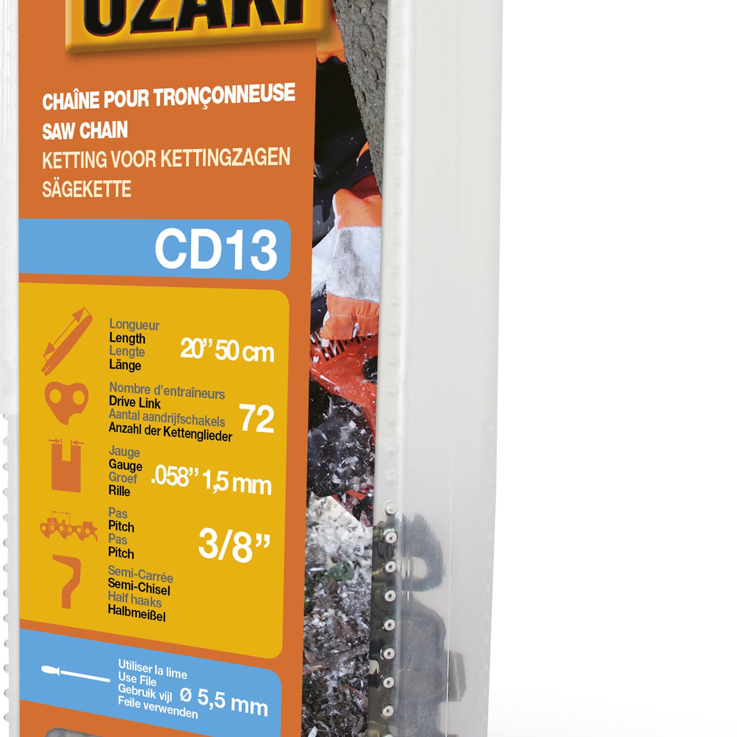 Chaîne de tronçonneuse OZAKI sous coque semi carrée: .3/8" .058 (1,5mm) 72 entraîneurs ( E72 ).