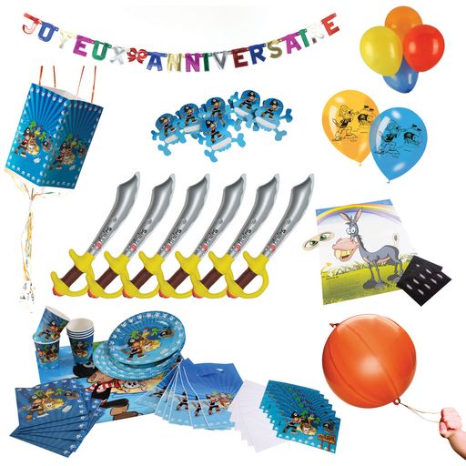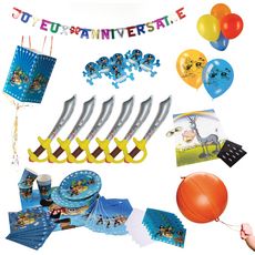 En savoir +LE pack idéal pour les parents pressés, en panne d'idée pour l'organisation des anniversaires de leurs enfants à la maison ! Ce pack contient tout pour préparer un anniversaire de A à Z: la vaisselle et déco de table, des ballons et guirlandes pour décorer la maison, et un kit de jeux pour animer la fête et offrir des petits souvenirs et bonbons aux invités ! Pack anniversaire thème "pirate" composé de : - Une chaîne Lettre Joyeux Anniversaire - 50 ballons couleurs assorties - 6 invitations Pirate - 2 ballons punchingballs - 6 badges Pirate - 6 sabres gonflables 60 cm - Un jeu de l’âne - Une Pinata souple Pirate - Kit 25 pièces Pirate : 6 Assiettes / 6 Serviettes / 6 Gobelets / 6 Sacs à bonbons / 1 Nappe.