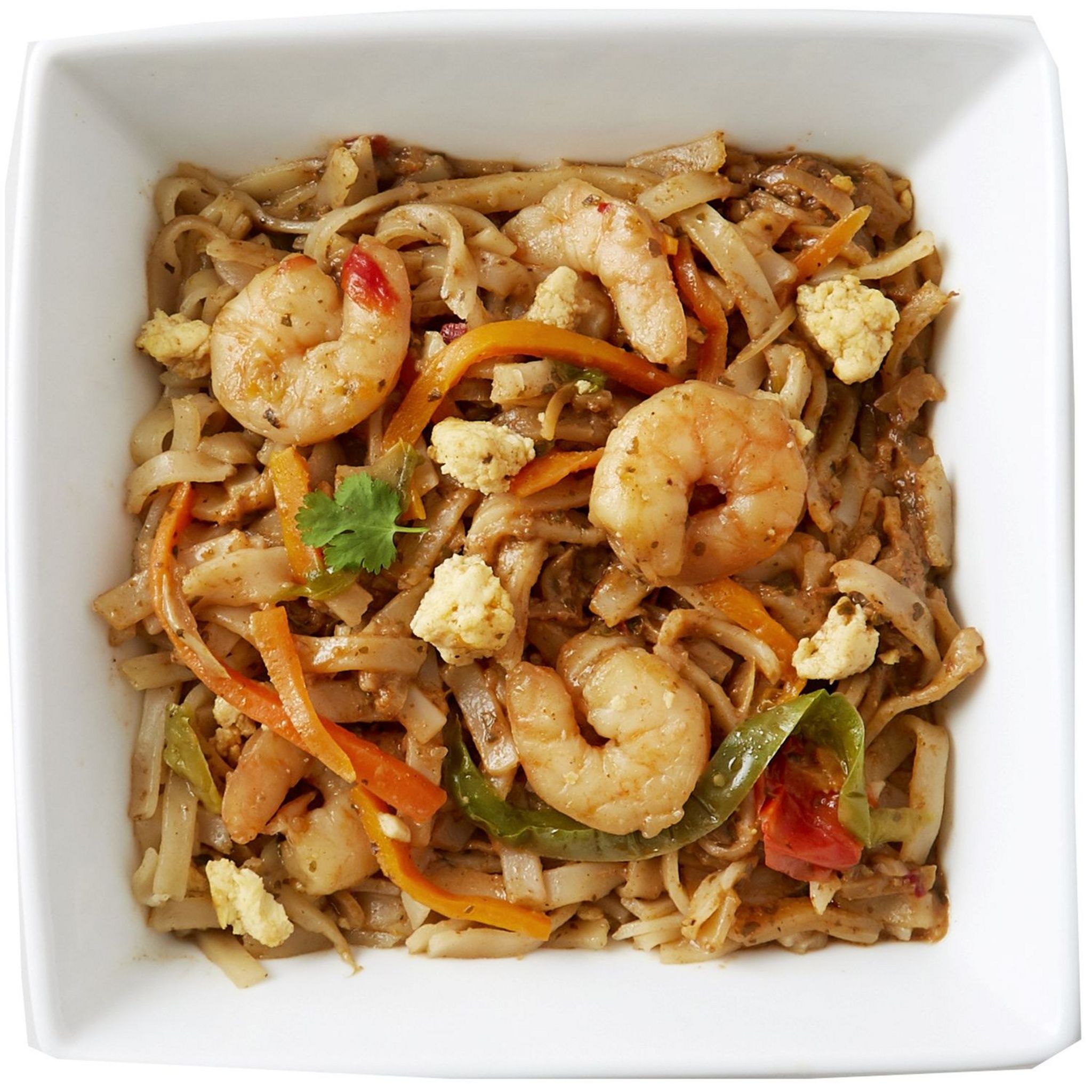 Eau, CREVETTE décortiquée crue 20% [CREVETTE (Litopenaeus vannamei - élevée en Inde) , eau, sel, acidifiants : acide ascorbique et citrate de sodium], nouilles de riz 14,0% (farine de riz, amidon de tapioca, eau, sel) ou nouilles de riz (farine de riz, eau), morceaux d’omelette préparée 5,0% [ŒUFS entiers, eau, huile de colza, amidon de pomme de terre, sel, jus de citron concentré], huile de colza, échalote 3,9%, oignon 3,6%, poivron rouge 3,4%, poivron vert 3,4%, carotte 3,4%, sucre, sauce au piment doux [sucre, eau, pâtes de piment (piments, sel, correcteur d'acidité : acide acétique), vinaigre d'alcool, sel, amidon modifié de maïs, ail en poudre], purée de tamarin (tamarin, eau, sel, antioxydant : acide citrique) ou purée de tamarin (tamarin, eau, sel, conservateur : benzoate de sodium), , beurre de CACAHUETES (ARACHIDES, sel), sauce de POISSON [POISSON (Stolephorus spp) sel, eau], sauce de SOJA (eau, graines de SOJA, farine de BLE, sel), coriandre 0,8%, ails, mélange d'épices et de plantes aromatiques (paprika, cumin, ail, poivre, origan, basilic, piment, sauge), sel. Traces éventuelles de lait, céleri, mollusques, moutarde, graines de sésame et fruits à coque.
