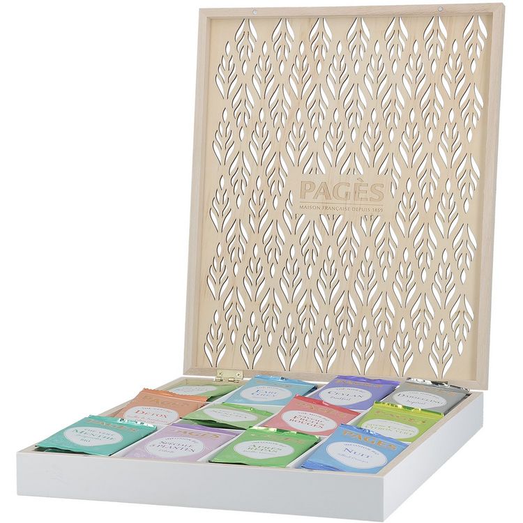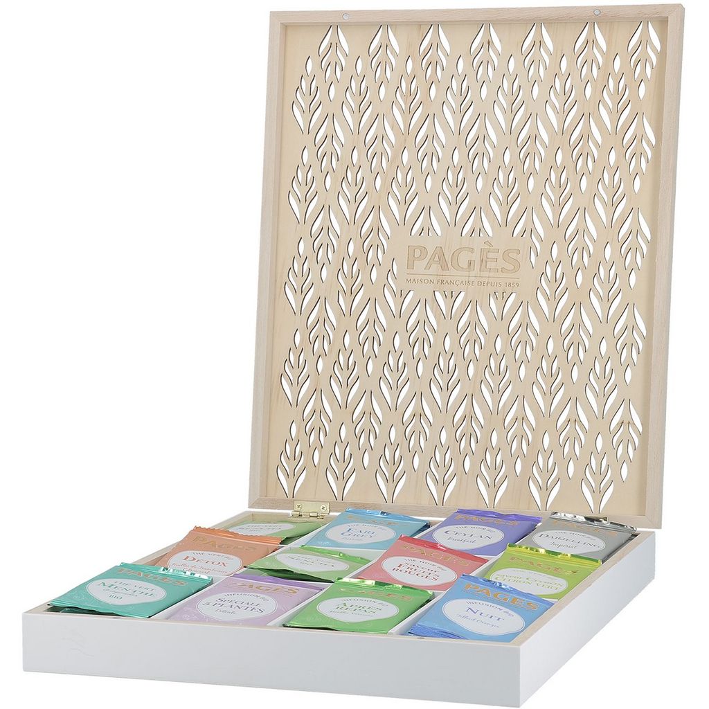 Composition : 5 sachets des recettes suivantes : - Thé noir Ceylan Breakfast - Thé noir Russian Earl Grey - Thé noir Fruits Rouges, (fraise myrtille) - Thé noir Darjeeling Impérial - Thé vert Sencha - Thé vert Menthe Gunpowder - Thé vert Citron Vert - Thé vert Detox (citron) - Infusion Après repas, (menthe verveine) - Infusion Nuit, (tilleul oranger) - Infusion 5 plantes COFFRET BOIS AJOURE PDM BIO 60 SACHETS