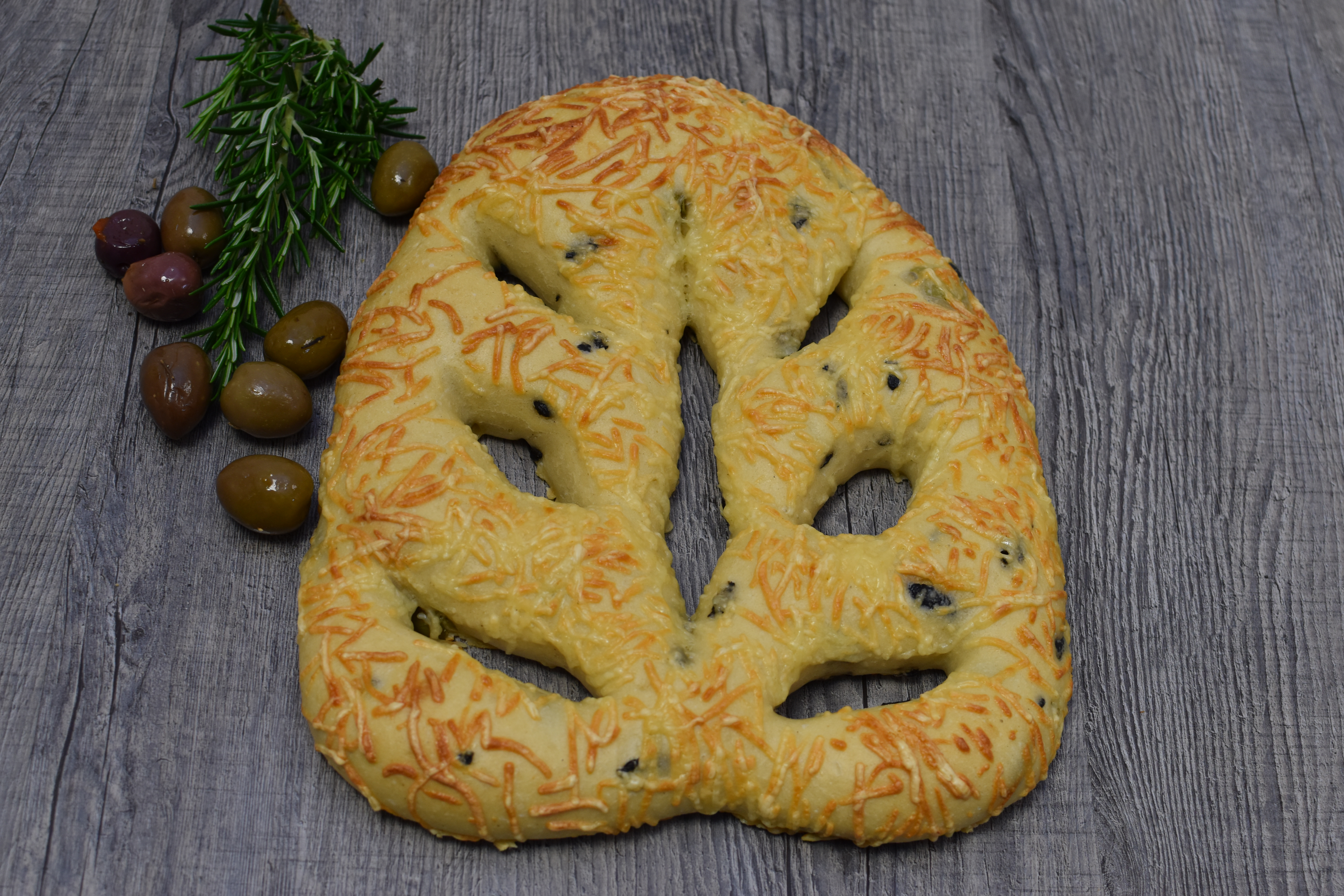 Farine de BLÉ, eau, EMMENTAL, olives vertes 4% (eau, sel, acidifiant : E330), olives noires 4% (eau, sel, stabilisant : E579), huile d'olive, levure, sel, GLUTEN de BLÉ, malt de BLÉ, antioxydant : E300.