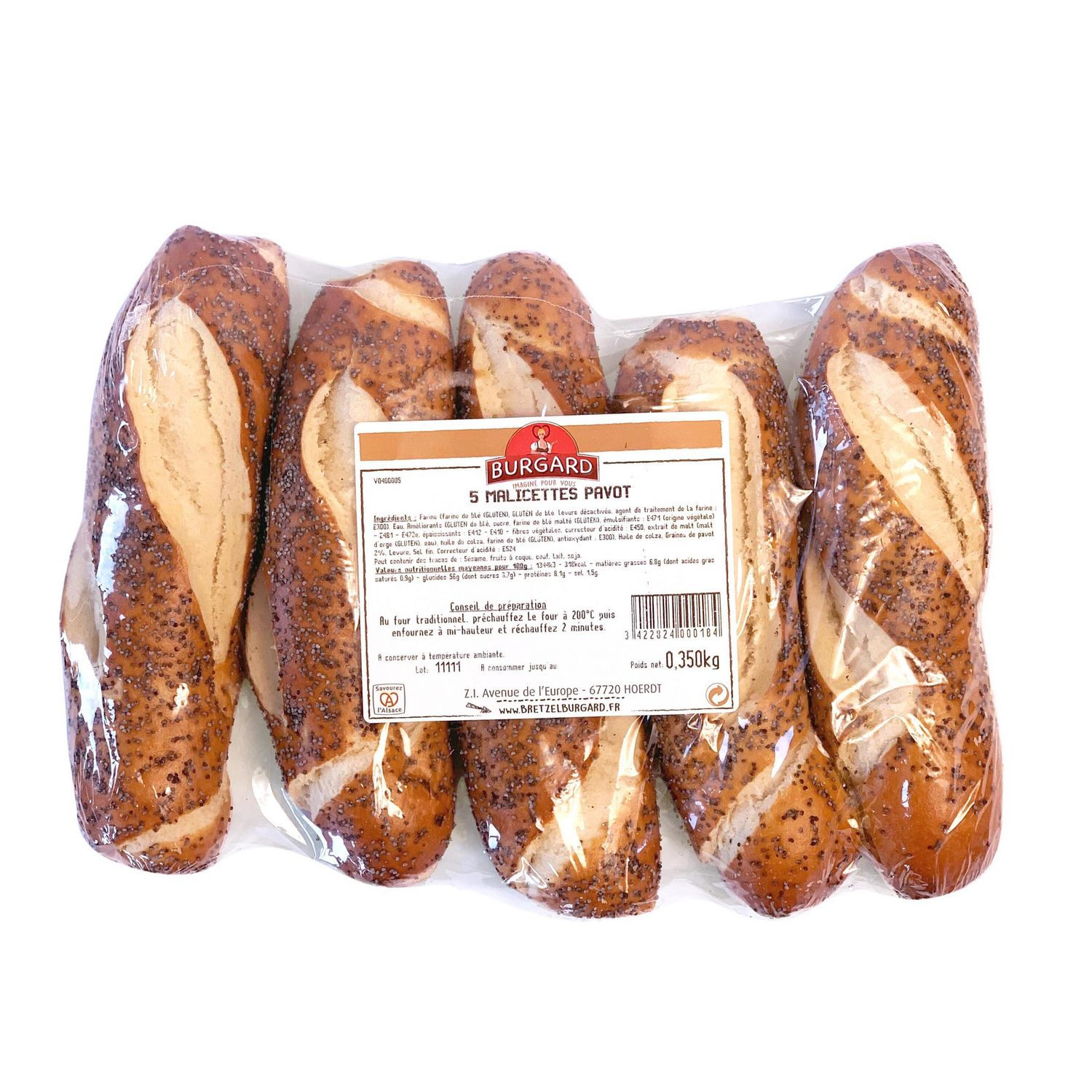 Ingrédients : Farine (farine de blé (GLUTEN), GLUTEN de blé, levure désactivée, agent de traitement de la farine : E300), Eau, Améliorants de panification (GLUTEN de blé, émulsifiants : E471-E481-E472e, farine de blé (GLUTEN), farine de fibre de pois, sucre, farine de blé malté (GLUTEN), épaississant : E412, correcteur d'acidité : E450, extrait de malt (malt d'orge (GLUTEN), eau), agent de traitement de la farine : E300, huile de colza), Huile de colza, Graines de pavot 1,7%, Levure, Sel fin, Correcteur d'acidité : E524.