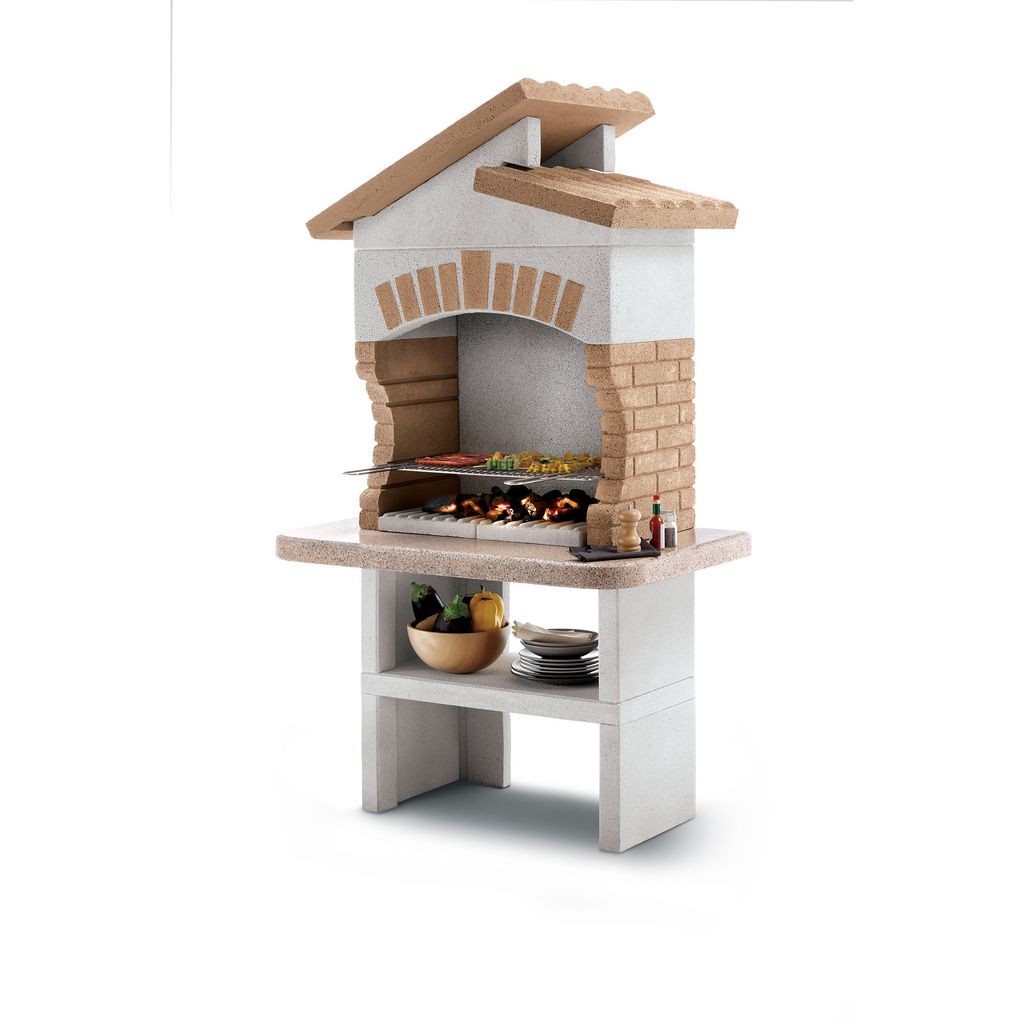 Barbecue en pierre Tupai - Plan de travail en Marmotech poli, finition briques - Dalles foyères réfractaires - Grille de cuisson (68 x 40 cm) réglable sur 4 positions - 110 x 71 x 193 (H) cm - Avec hotte - Combustible : Charbon de bois, bois.