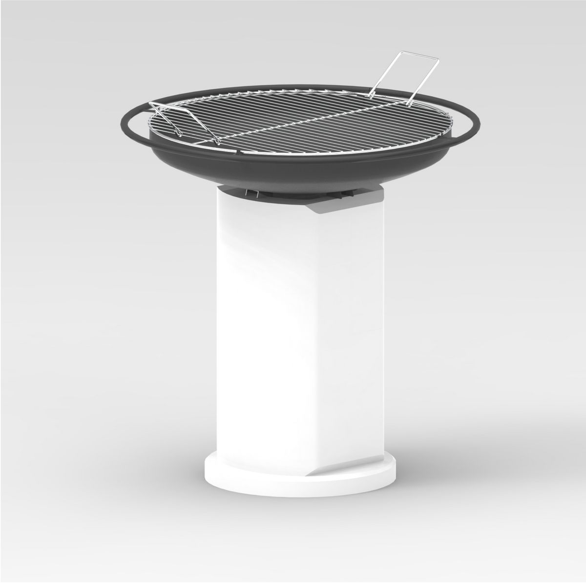 BRASERO -BARBECUE APOLLO 60. Réalisé en acier de grosse épaisseur avec anneau distanceur de protection verni epoxy, livré avec grande grille de cuisson chromée Ø 60 cm équipée de poignées. Grande surface de cuisson: 2826 cm2. Sur solide base en béton à assembler à l'aide de la colle spéciale fournie. La base en béton est livrée grise, à peindre selon vos propres goûts. Dimensions Ø 70 x h.78 cm, poids net 60 kg - brut 70 kg, emballage palette 80x80xh50 cm