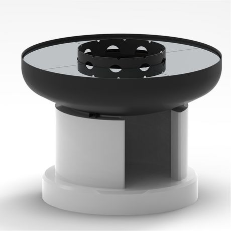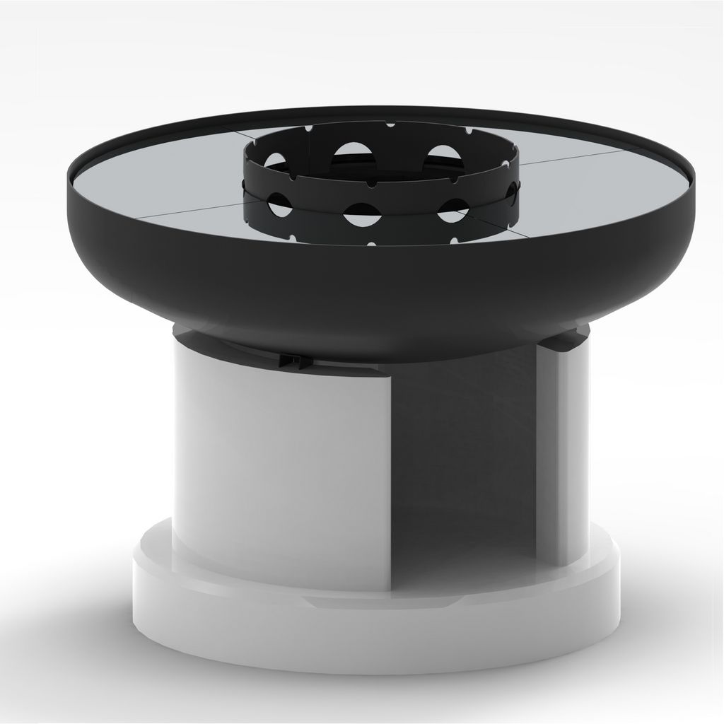 BRASERO-PLANCHA EFESTO 90. Réalisé en acier de grosse épaisseur verni époxy, ce braséro est équipé de 4 plaques de cuisson en acier inoxydable de 8 mm d'épaisseur, d'anneau de maintien pour éviter la chute des aliments dans le feu ou sur les braises. La base est en béton à assembler et peindre à l'aide du kit de montage fourni. Livré avec housse de protection et tisonnier. Grande surface de cuisson = 5103 cm2. Dimensions Ø 90 x h. 50 cm. Poids net 160 kg, brut 190 kg, emballage palette 99x80xh110 cm
