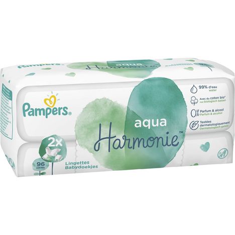 Pampers Aqua Harmonie Lingettes Pour Bébé 2 Paquets Soit 96 Lingettes Lingettes Pampers Aqua Harmonie : composées à 99 % d’eau pure et de coton bio (coton biologique). Elles aident à protéger la peau délicate de votre bébé. Elles ne contiennent pas d’alcool ni de parfum. Le 1 % restant se compose de nettoyants doux testés dermatologiquement et d’ingrédients permettant de maintenir le pH naturel de la peau de votre bébé et ainsi protéger sa peau des irritations. Adaptées aux peaux délicates des nouveau-nés, les lingettes Aqua Harmonie peuvent être utilisées pour le visage, les mains et le siège de bébé.