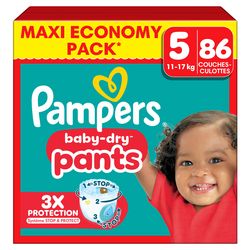 Lorsque votre bébé commence à bouger de plus en plus, il vous faut des couches-culottes qui suivent tous ses mouvements. Grâce à leur système Stop & Protect révolutionnaire, les couches-culottes Pampers Baby-Dry Pants offrent une protection intégrale supérieure contre les fuites, quelle que soit la position dans laquelle votre bout de chou se trouve, jour et nuit. Le système Stop & Protect de Pampers Baby-Dry Pants comprend : des barrières anti-fuites 2 x plus larges* qui aident à éviter les fuites au niveau des jambes, une poche qui aide à capturer les fuites à l'arrière, une ceinture flexible 360°, qui épouse les contours du corps de votre tout-petit quand il bouge et un cœur super absorbant offrant jusqu'à 12 heures de protection. Comme toutes nos couches-culottes, les couches-culottes Pampers Baby-Dry Pants sont faciles à changer même lorsque votre bébé gigote : faciles à enfiler en un seul geste, faciles à retirer en déchirant les côtés, et faciles à jeter en les enroulant grâce à la bande adhésive. Comme pour vous, la sécurité de votre bébé est notre priorité : Les couches-culottes Pampers Baby-Dry Pants sont approuvées dermatologiquement et contiennent 0% d'allergènes de parfum listés par l'UE (comme réglementé par la réglementation cosmétique de l'UE N°1223/2009). Elles sont approuvées par les dermatologues de la Skin Health Alliance et testées et certifiées Standard 100 par OEKO-TEX. Vous souhaitez en savoir plus sur la composition de nos produits Pampers ? Visitez pampers.fr. *par rapport à avant.