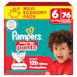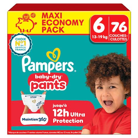 Lorsque votre bébé commence à bouger de plus en plus, il vous faut des couches-culottes qui suivent tous ses mouvements avec un maintien qui le protège contre les fuites. Grâce à leur système révolutionnaire Stop & Protect, nos couches-culottes Pampers Baby-Dry Pants offrent une protection 360° contre les fuites ! Le système Stop & Protect des couches-culottes Baby-Dry Pants comprend : des barrières anti-fuites au niveau des jambes, une poche pour capturer les fuites à l'arrière, une ceinture ultra-extensible 360° qui épouse la morphologie de votre bébé, et un cœur super absorbant offrant jusqu'à 12 heures de protection. Comme toutes nos couches-culottes, Baby-Dry Pants assure une facilité d'utilisation même lorsque votre bébé gigote : faciles à enfiler en un seul geste, faciles à retirer en déchirant les côtés, et faciles à jeter en les enroulant grâce à la bande adhésive. Comme pour vous, chez Pampers la sécurité de votre bébé est une priorité : les couches-culottes Baby-Dry Pants sont approuvées dermatologiquement et contiennent 0% d'allergènes de parfum listés par l'UE (comme règlementé par la réglementation cosmétique de l'UE N° 1223/2009). Elles sont approuvées par les dermatologues de la Skin Health Alliance et sont testées et certifiées Standard 100 par OEKO-TEX. Vous souhaitez en savoir plus sur les composants utilisés par Pampers ? Visitez notre site internet pampers.fr.