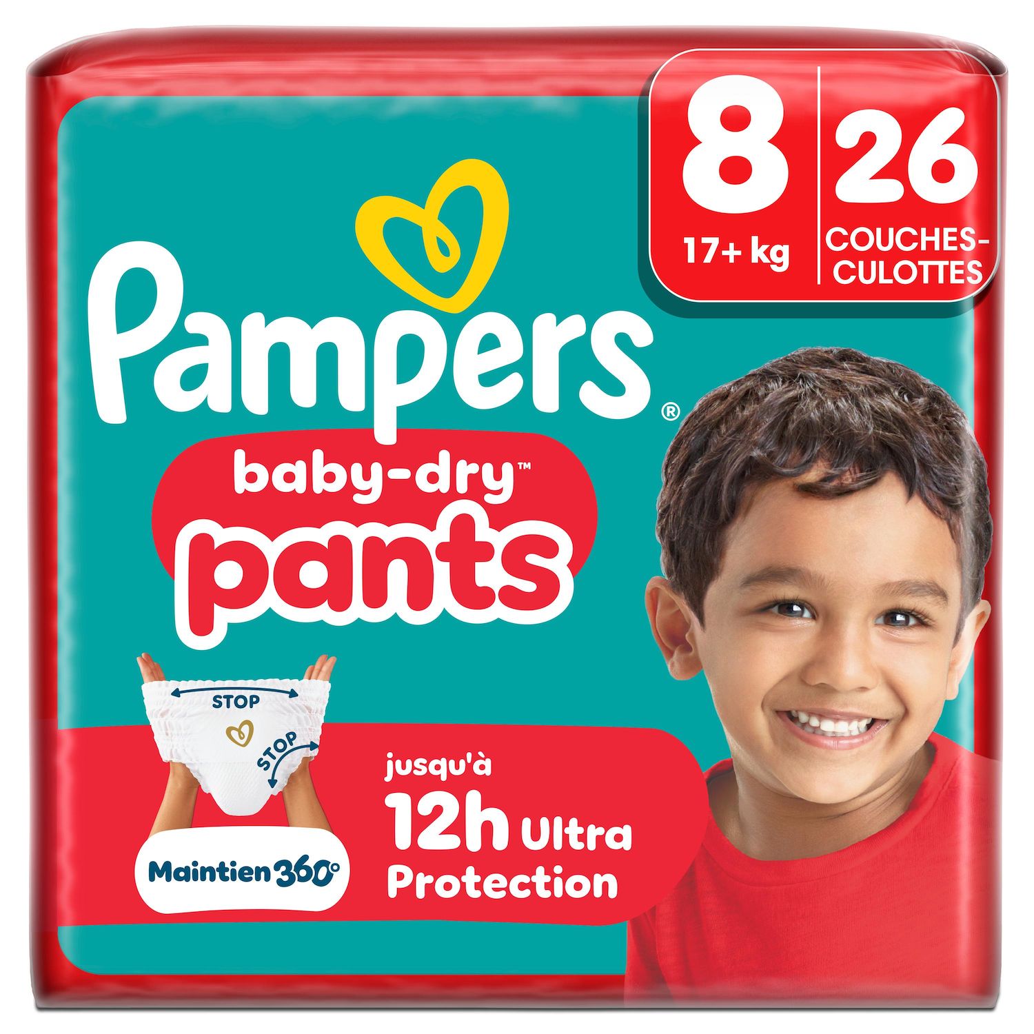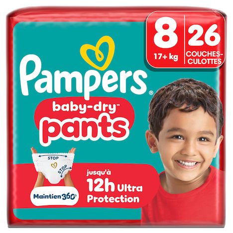 Lorsque votre bébé commence à bouger de plus en plus, il vous faut des couches-culottes qui suivent tous ses mouvements avec un maintien qui le protège contre les fuites. Grâce à leur système révolutionnaire Stop & Protect, nos couches-culottes Pampers Baby-Dry Pants offrent une protection 360° contre les fuites jour et nuit ! Le système Stop & Protect des couches-culottes Baby-Dry Pants comprend : des barrières anti-fuites au niveau des jambes, une ceinture ultra-extensible 360° qui épouse la morphologie de votre bébé, et un cœur super absorbant offrant jusqu'à 12 heures de protection. Comme toutes nos couches-culottes, Baby-Dry Pants assure une facilité d'utilisation même lorsque votre bébé gigote : faciles à enfiler en un seul geste, faciles à retirer en déchirant les côtés, et faciles à jeter en les enroulant grâce à la bande adhésive. Comme pour vous, chez Pampers la sécurité de votre bébé est une priorité : les couches-culottes Baby-Dry Pants sont approuvées dermatologiquement et contiennent 0% d'allergènes de parfum listés par l'UE (comme règlementé par la réglementation cosmétique de l'UE N° 1223/2009). Elles sont approuvées par les dermatologues de la Skin Health Alliance et sont testées et certifiées Standard 100 par OEKO-TEX. Vous souhaitez en savoir plus sur les composants utilisés par Pampers ? Visitez notre site internet pampers.fr.