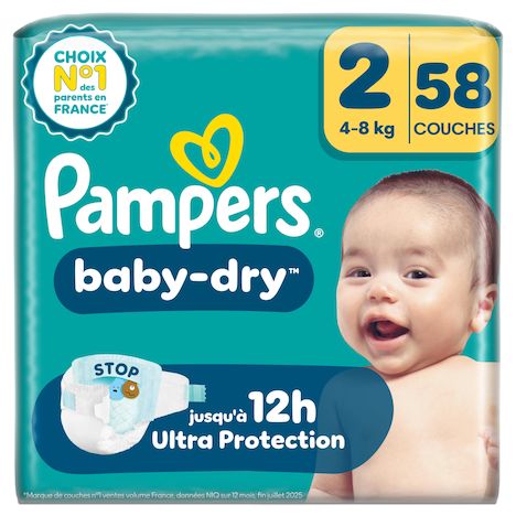 Gardez votre bébé au sec et protégé toute la nuit avec les couches Pampers Baby-Dry. Conçues avec notre cœur InstantAbsorb unique, elles absorbent rapidement l'humidité pour offrir une nuit confortable et jusqu'à 100% sans fuites. La poche Stop & Protect aide à prévenir les fuites à l'arrière de la couche, tandis que les matériaux doux ComfortTouch enveloppent la peau de votre bébé en douceur. Les couches Pampers Baby-Dry offrent une protection fiable grâce aux doubles barrières anti-fuites pour une protection supplémentaire et à leur indicateur d'urine qui vous informe quand il est temps de changer la couche. Testées dermatologiquement, sans allergènes de parfum listés par l'UE et certifiées Standard 100 par OEKO-TEX, elles sont sûres pour la peau de votre bébé.