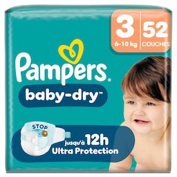 Gardez votre bébé au sec et protégé toute la nuit avec les couches Pampers Baby-Dry. Conçues avec notre cœur InstantAbsorb unique, elles absorbent rapidement l'humidité pour offrir une nuit confortable et jusqu'à 100% sans fuites. La poche Stop & Protect aide à prévenir les fuites à l'arrière de la couche, tandis que les matériaux doux ComfortTouch enveloppent la peau de votre bébé en douceur. Les couches Pampers Baby-Dry offrent une protection fiable grâce aux doubles barrières anti-fuites pour une protection supplémentaire et à leur indicateur d'urine qui vous informe quand il est temps de changer la couche. Testées dermatologiquement, sans allergènes de parfum listés par l'UE et certifiées Standard 100 par OEKO-TEX, elles sont sûres pour la peau de votre bébé.