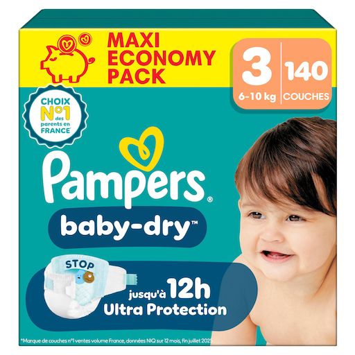 Gardez votre bébé au sec et protégé toute la nuit avec les couches Pampers Baby-Dry. Conçues avec notre cœur InstantAbsorb unique, elles absorbent rapidement l'humidité pour offrir une nuit confortable et jusqu'à 100% sans fuites. La poche Stop & Protect aide à prévenir les fuites à l'arrière de la couche, tandis que les matériaux doux ComfortTouch enveloppent la peau de votre bébé en douceur. Les couches Pampers Baby-Dry offrent une protection fiable grâce aux doubles barrières anti-fuites pour une protection supplémentaire et à leur indicateur d'urine qui vous informe quand il est temps de changer la couche. Testées dermatologiquement, sans allergènes de parfum listés par l'UE et certifiées Standard 100 par OEKO-TEX, elles sont sûres pour la peau de votre bébé.
