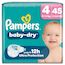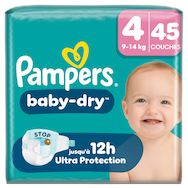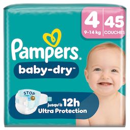 Gardez votre bébé au sec et protégé toute la nuit avec les couches Pampers Baby-Dry. Conçues avec notre cœur InstantAbsorb unique, elles absorbent rapidement l'humidité pour offrir une nuit confortable et jusqu'à 100% sans fuites. La poche Stop & Protect aide à prévenir les fuites à l'arrière de la couche, tandis que les matériaux doux ComfortTouch enveloppent la peau de votre bébé en douceur. Les couches Pampers Baby-Dry offrent une protection fiable grâce aux doubles barrières anti-fuites pour une protection supplémentaire et à leur indicateur d'urine qui vous informe quand il est temps de changer la couche. Testées dermatologiquement, sans allergènes de parfum listés par l'UE et certifiées Standard 100 par OEKO-TEX, elles sont sûres pour la peau de votre bébé.