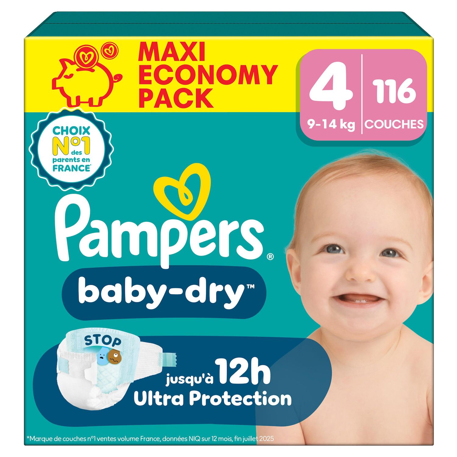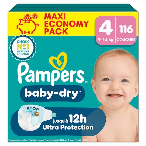 Gardez votre bébé au sec et protégé toute la nuit avec les couches Pampers Baby-Dry. Conçues avec notre cœur InstantAbsorb unique, elles absorbent rapidement l'humidité pour offrir une nuit confortable et jusqu'à 100% sans fuites. La poche Stop & Protect aide à prévenir les fuites à l'arrière de la couche, tandis que les matériaux doux ComfortTouch enveloppent la peau de votre bébé en douceur. Les couches Pampers Baby-Dry offrent une protection fiable grâce aux doubles barrières anti-fuites pour une protection supplémentaire et à leur indicateur d'urine qui vous informe quand il est temps de changer la couche. Testées dermatologiquement, sans allergènes de parfum listés par l'UE et certifiées Standard 100 par OEKO-TEX, elles sont sûres pour la peau de votre bébé.