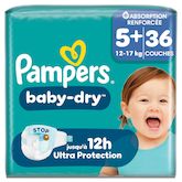 Gardez votre bébé au sec et protégé toute la nuit avec les couches Pampers Baby-Dry Taille Plus. Conçues avec notre cœur InstantAbsorb renforcé unique, elles éloignent l'humidité en continu et la retiennent rapidement, offrant ainsi une capacité d'absorption plus grande que les tailles régulières pour une nuit confortable et jusqu'à 100% sans fuites. La poche Stop & Protect aide à prévenir les fuites à l'arrière de la couche, tandis que les matériaux doux ComfortTouch enveloppent la peau de votre bébé en douceur. Les couches Pampers Baby-Dry Taille Plus offrent une protection fiable qui dure encore plus longtemps grâce aux doubles barrières anti-fuites pour une protection supplémentaire et à leur indicateur d'urine qui vous indique quand il est temps de changer la couche. Testées dermatologiquement, sans allergènes de parfum listés par l'UE et certifiées Standard 100 par OEKO-TEX, elles sont sûres pour la peau de votre bébé.