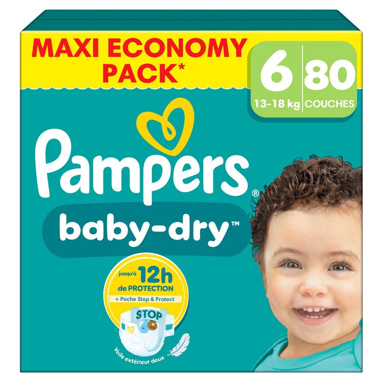 Découvrez les couches Pampers Baby-Dry, spécialement conçues pour suivre les mouvements de votre bébé, pour une nuit confortable et jusqu'à 100% sans fuites. Grâce à leur absorption améliorée, ces couches absorbent et capturent rapidement l'humidité, gardant votre bébé bien au sec pendant de longues périodes. De plus, la poche Stop & Protect aide à prévenir les fuites à l'arrière de la couche. Fabriquées avec des matériaux de haute qualité, nos couches Baby-Dry enveloppent la peau de votre bébé en douceur. Chez Pampers, la sécurité de votre bébé est notre priorité absolue. C'est pourquoi nos couches Baby-Dry sont soumises à des tests dermatologiques rigoureux et ne contiennent aucun des allergènes de parfum listés par l'UE, comme règlementé par la réglementation cosmétique n° 1223/2009 de l'UE. Nous détenons également la certification Standard 100 par OEKO-TEX, vous garantissant leur qualité et leur sécurité. Tout cela pour dire adieu aux fuites et bonjour à des nuits de sommeil confortables. Vous souhaitez en savoir plus sur la composition de nos produits ? Visitez pampers.fr