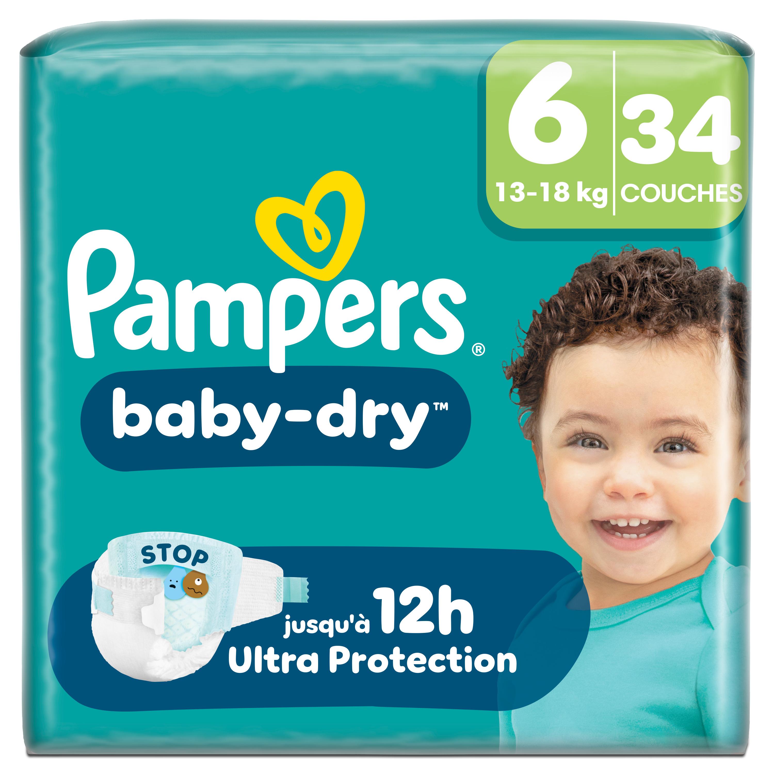 Gardez votre bébé au sec et protégé toute la nuit avec les couches Pampers Baby-Dry. Conçues avec notre cœur InstantAbsorb unique, elles absorbent rapidement l'humidité pour offrir une nuit confortable et jusqu'à 100% sans fuites. La poche Stop & Protect aide à prévenir les fuites à l'arrière de la couche, tandis que les matériaux doux ComfortTouch enveloppent la peau de votre bébé en douceur. Les couches Pampers Baby-Dry offrent une protection fiable grâce aux doubles barrières anti-fuites pour une protection supplémentaire et à leur indicateur d'urine qui vous informe quand il est temps de changer la couche. Testées dermatologiquement, sans allergènes de parfum listés par l'UE et certifiées Standard 100 par OEKO-TEX, elles sont sûres pour la peau de votre bébé.