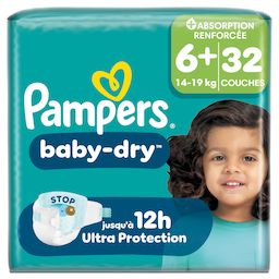 Gardez votre bébé au sec et protégé toute la nuit avec les couches Pampers Baby-Dry Taille Plus. Conçues avec notre cœur InstantAbsorb renforcé unique, elles éloignent l'humidité en continu et la retiennent rapidement, offrant ainsi une capacité d'absorption plus grande que les tailles régulières pour une nuit confortable et jusqu'à 100% sans fuites. La poche Stop & Protect aide à prévenir les fuites à l'arrière de la couche, tandis que les matériaux doux ComfortTouch enveloppent la peau de votre bébé en douceur. Les couches Pampers Baby-Dry Taille Plus offrent une protection fiable qui dure encore plus longtemps grâce aux doubles barrières anti-fuites pour une protection supplémentaire et à leur indicateur d'urine qui vous indique quand il est temps de changer la couche. Testées dermatologiquement, sans allergènes de parfum listés par l'UE et certifiées Standard 100 par OEKO-TEX, elles sont sûres pour la peau de votre bébé.