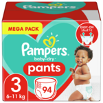 Lorsque votre bébé commence à gigoter, les couches classiques peuvent être difficiles à mettre. Découvrez alors les couches-culottes Pampers Baby-Dry Pants qui sont faciles à changer : faciles à enfiler en un seul geste, faciles à retirer en déchirant les côtés, et faciles à jeter grâce à la bande adhésive. Les couches-culottes Pampers Baby-Dry aident à éviter les bâillements et les fuites, pour une bonne nuit de sommeil. Grâce à leur maintien complet 360°, conçue avec (1) une ceinture ultra-extensible qui s’adapte au ventre de votre bébé, (2) un cœur super absorbant qui absorbe l’humidité instantanément et (3) une double barrière anti-fuites qui aide à éviter les fuites au niveau des jambes. Couches-culottes Pampers Baby-Dry Pants : pour des changes faciles la journée et une protection contre les fuites la nuit. Si vous souhaitez en savoir plus sur la composition des produits Pampers, visitez pampers.fr Pampers Baby-Dry Pants Couches-Culottes Taille 3, 94 Culottes, 6kg-11kg